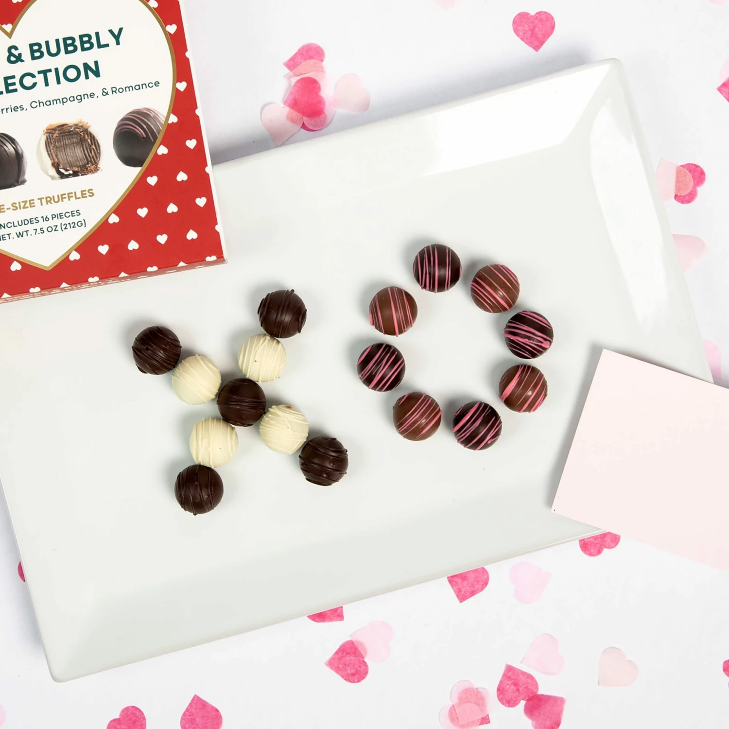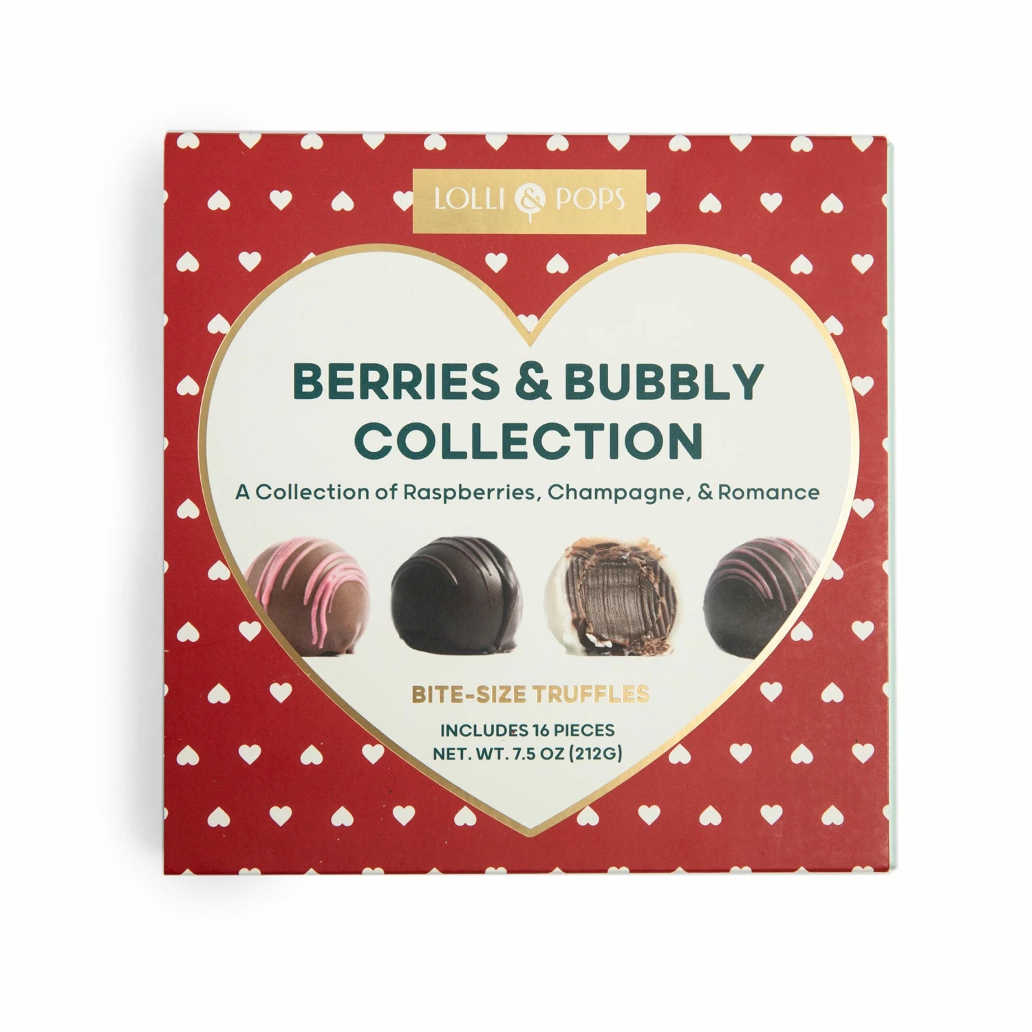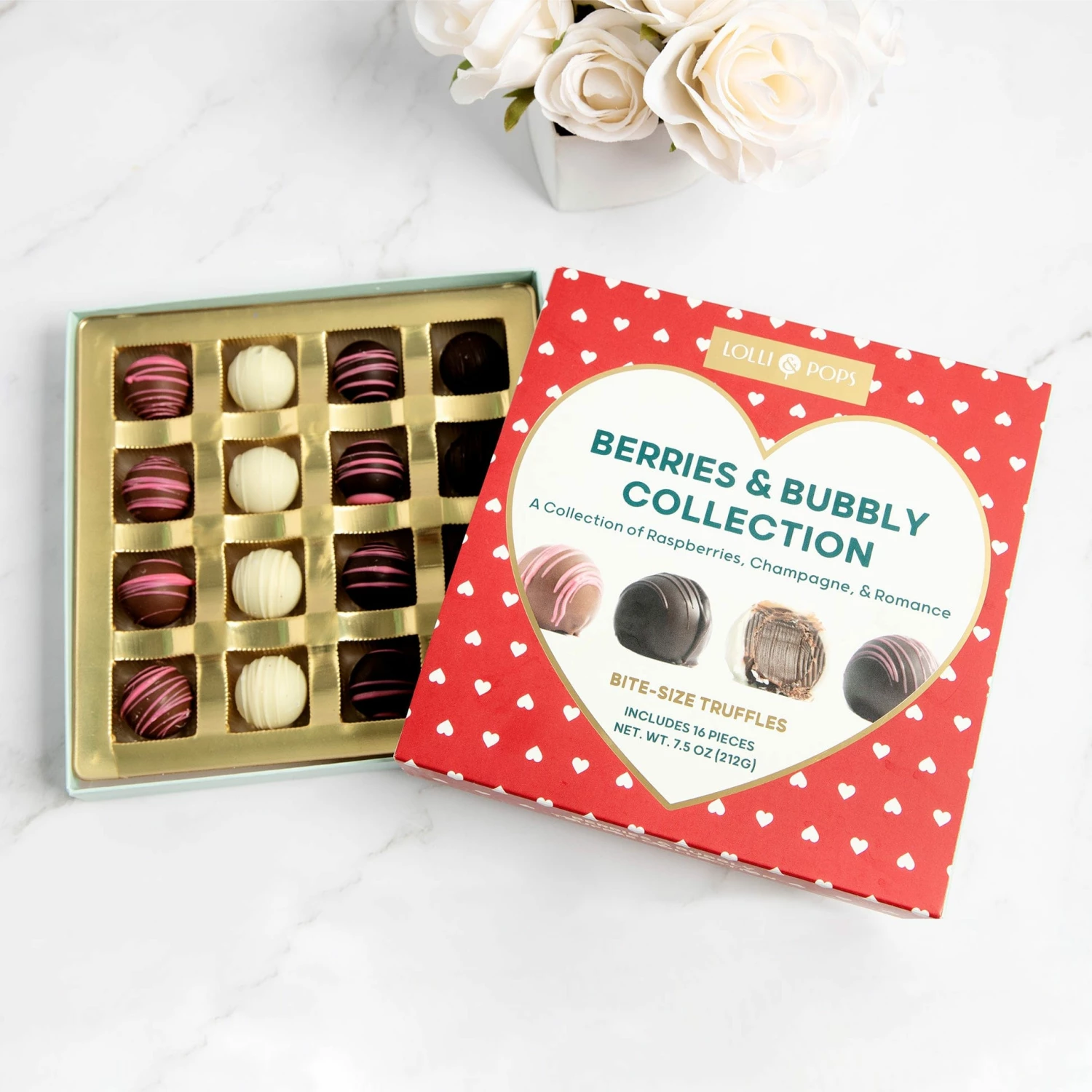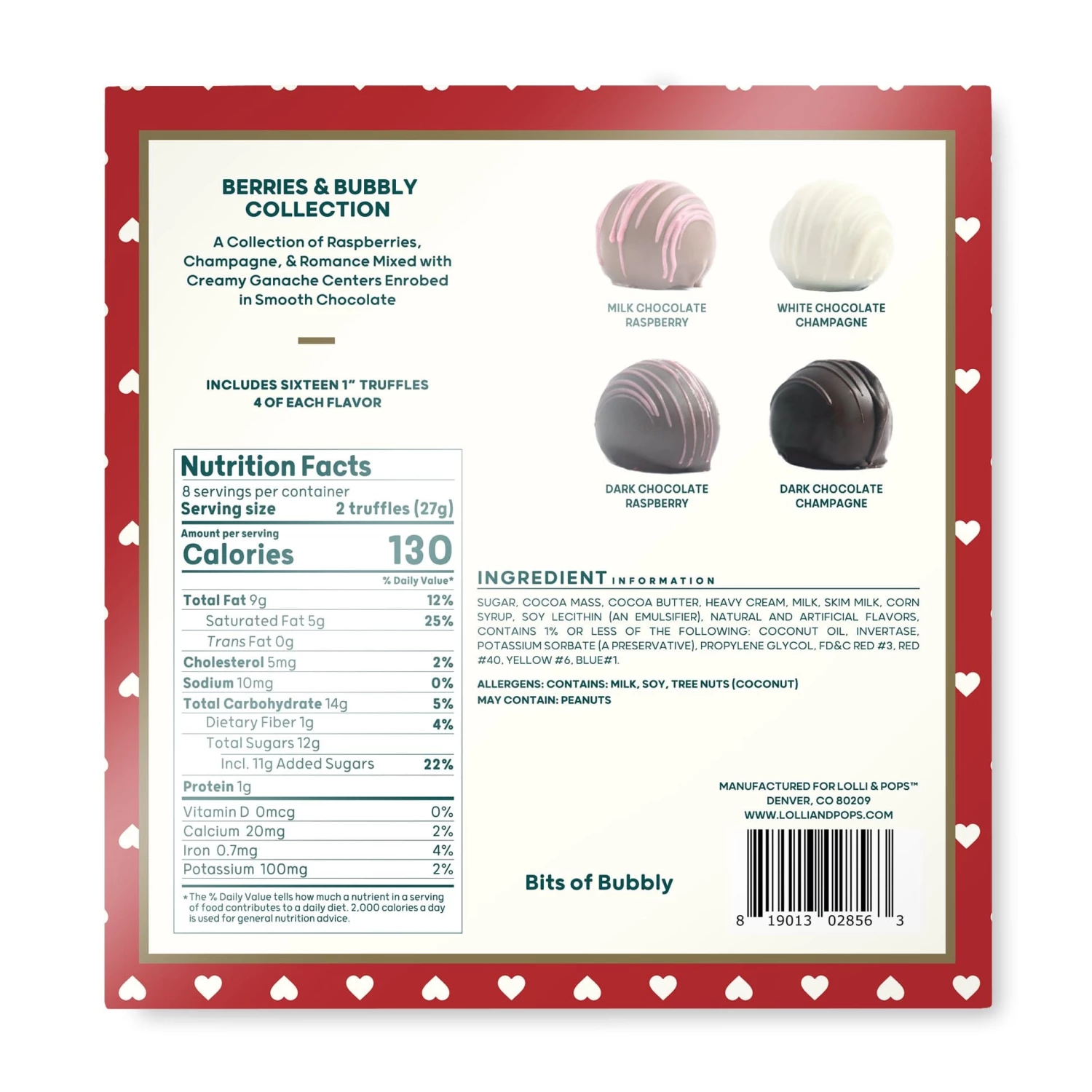 A collection of raspberries, champagne, and romance. Featuring four decadent, bite-sized truffle flavors: milk chocolate raspberry, white chocolate champagne, dark chocolate raspberry, and dark chocolate champagne.