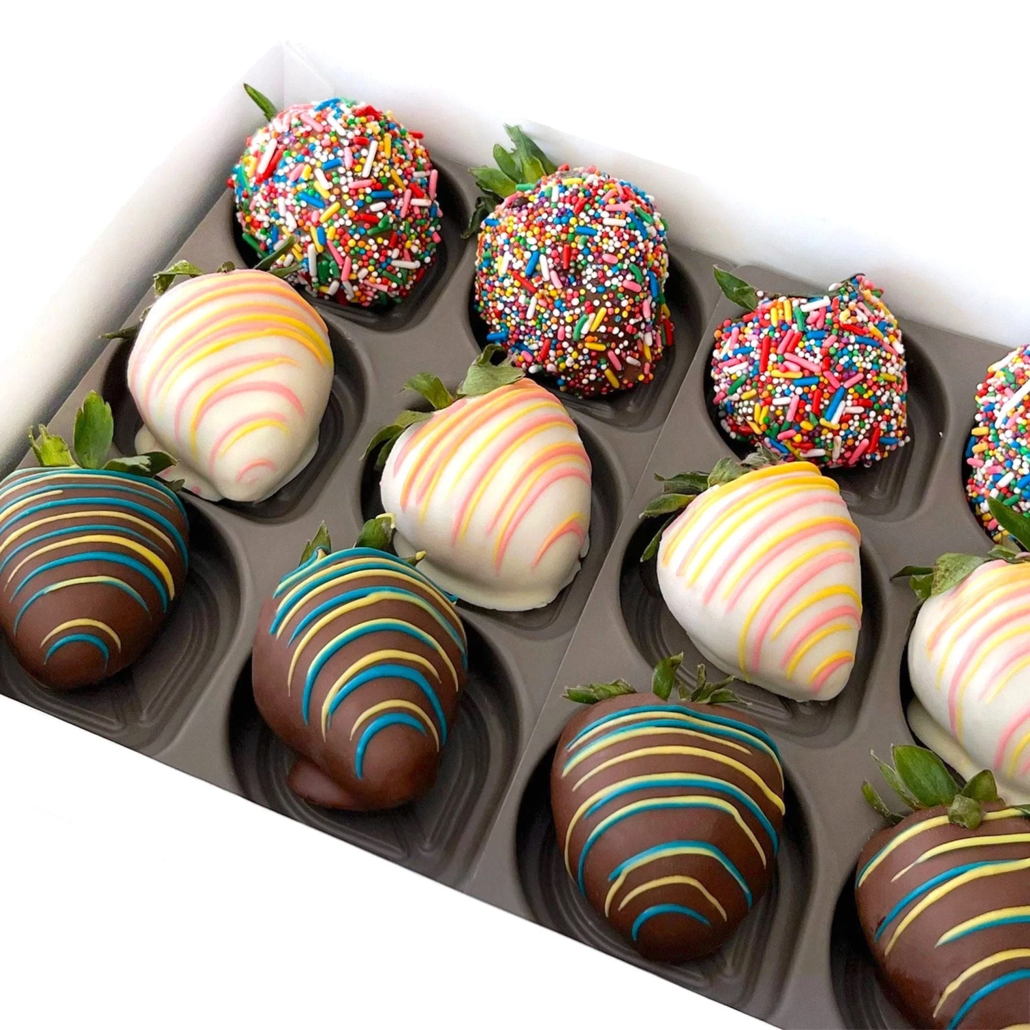 Give the perfect birthday gift of ripe and juicy red strawberries that are hand-dipped in milk, dark or white Belgian chocolate and coated with both chocolate drizzle and festive sprinkles.