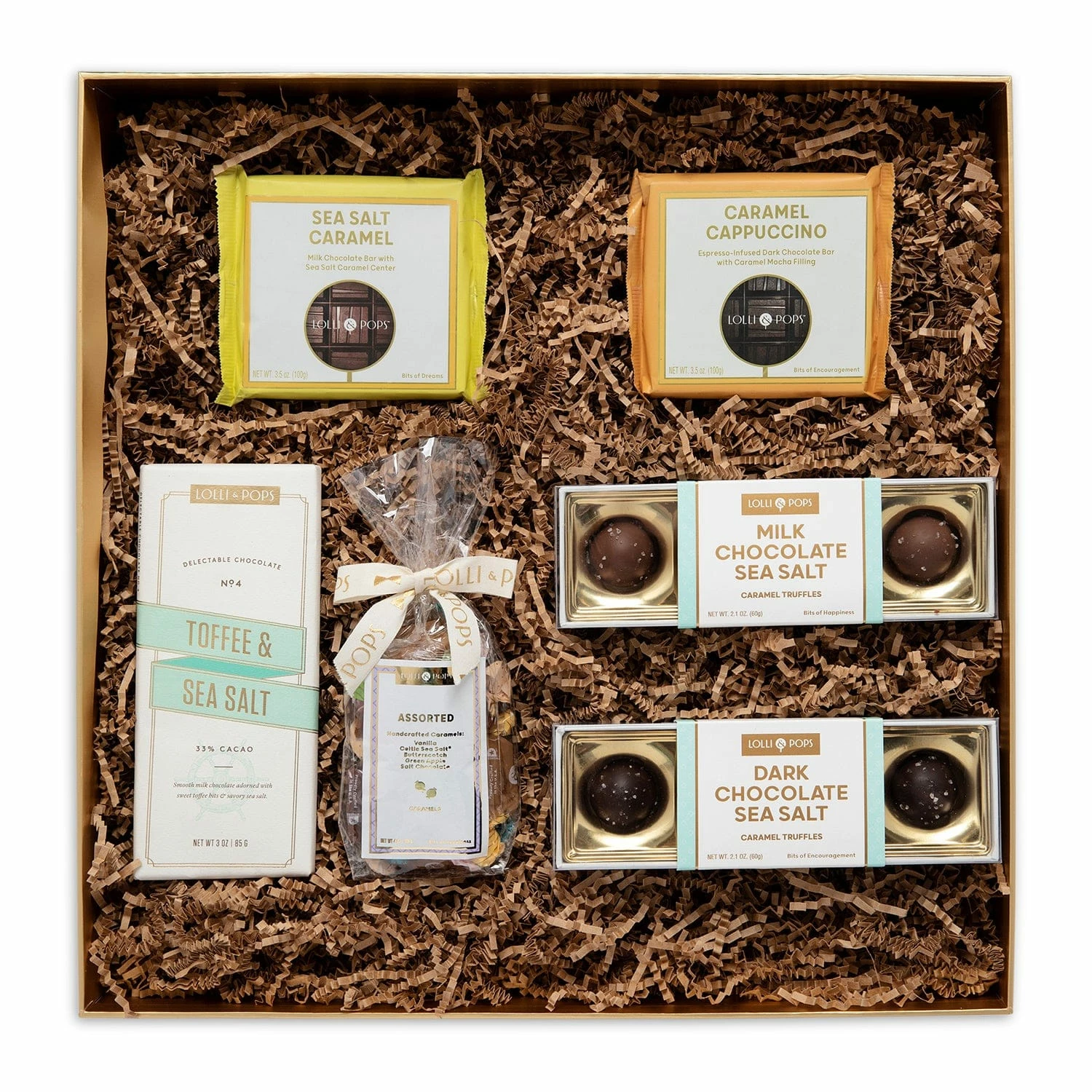 Caramel cravings? This caramel-centered gift box has you covered! Ranging from bite-sized flavored caramels, and soft chocolate with caramel inclusions, to chocolate and caramel truffles, this Caramel Cravings gift box is sure to cover all the bases. CONTAINS: 1 x Lolli & Pops Assorted Caramel Bag (4 oz) 1 x Lolli & Pops Milk Chocolate Sea Salt Caramel Square Bar (3.5 oz) 1 x Lolli & Pops Caramel Cappuccino Square Bar (3.5 oz) 1 x Lolli & Pops 4 Piece Dark Chocolate Sea Salt Caramel Truffles (2.1 oz) 1 x Lolli & Pops Milk Chocolate Toffee Sea Salt Signature Bar (3 oz) 1 x Lolli & Pops 4 Piece Milk Chocolate Caramel Sea Salt Truffles (2.1 oz)