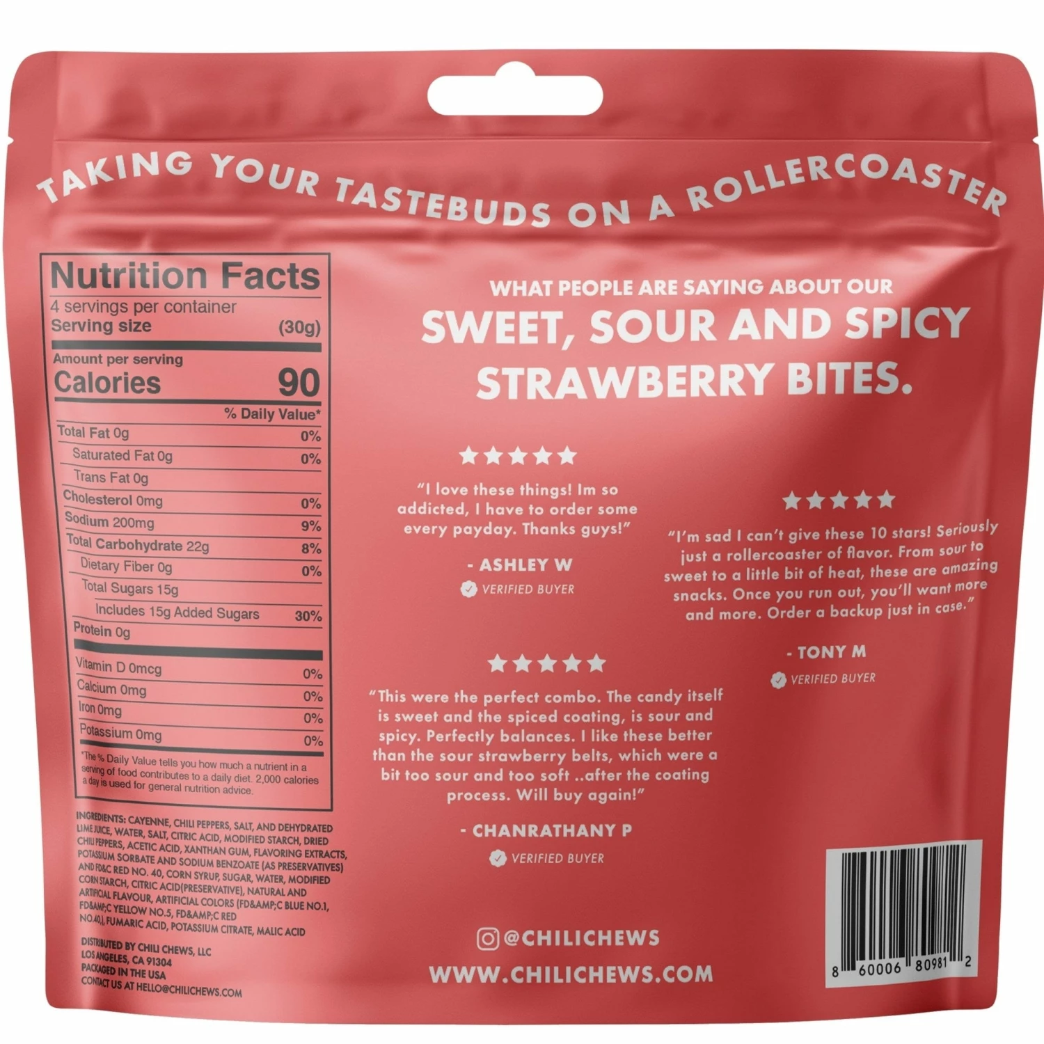 Perfectly ripe, juicy and sour strawberry flavored gummies paired with an explosive tingle of sweet & salty chili coating.