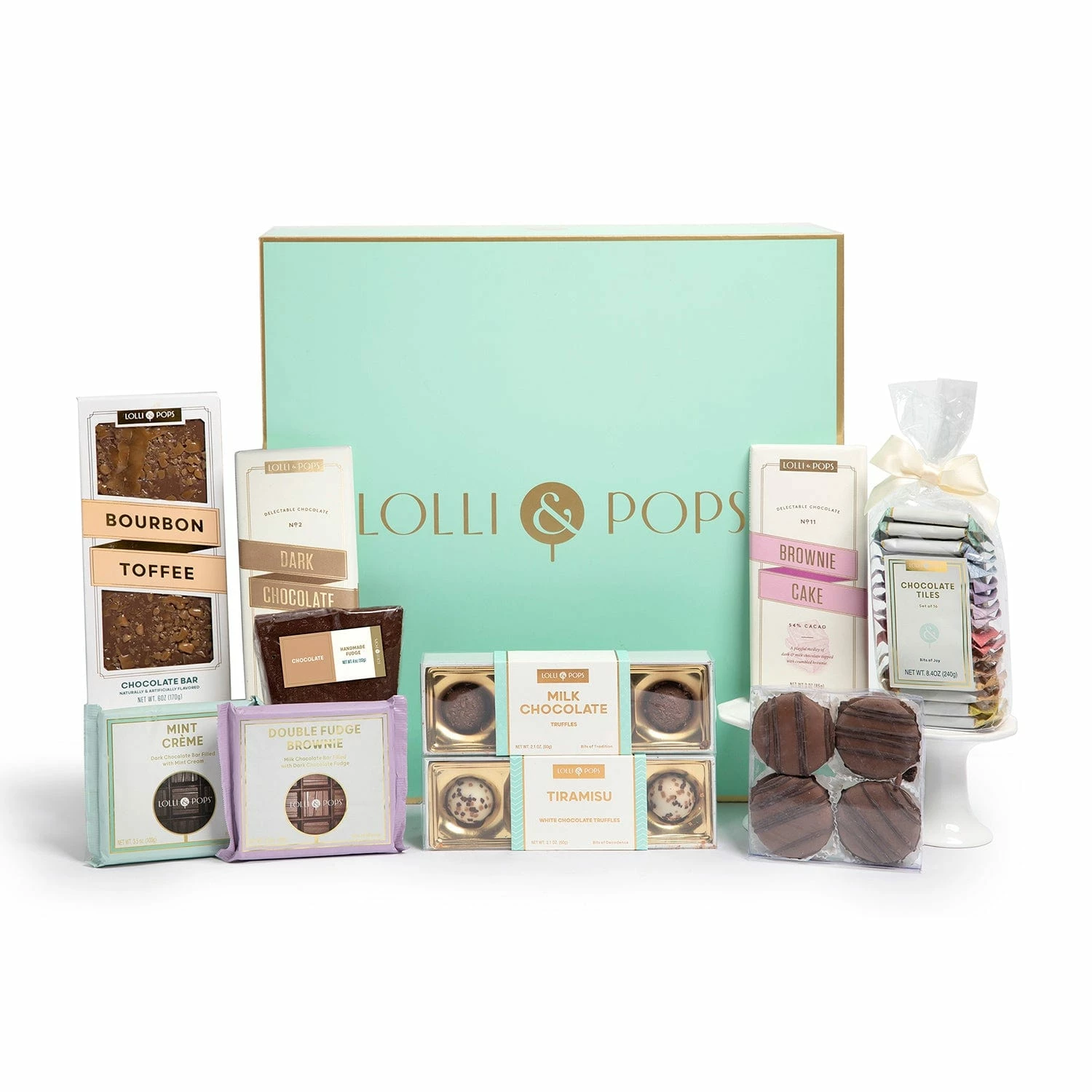 1 x Lolli & Pops 72% Dark Chocolate Signature Bar (3 oz),1 x Lolli & Pops Chocolate Brownie Signature Bar (3 oz),1 x Lolli & Pops Double Fudge Brownie Bar (3.5 oz),1 x Lolli & Pops 16 Piece Chocolate Tile Bag (8.4 oz),1 x Lolli & Pops Mint Crème Bar (3.5 oz),1 x Lolli & Pops Tiramisu White Chocolate Truffle 4 Piece (2.1 oz)1 x Lolli & Pops Milk Chocolate Truffle 4 Piece (2.1 oz)1 x Lolli & Pops Bourbon Toffee Topp’d Bar (6 oz)1 x Lolli & Pops Peanut Butter Sandwich Cookie 4 Pack (3.7 oz)1 x Lolli & Pops Chocolate Fudge (4 oz)
