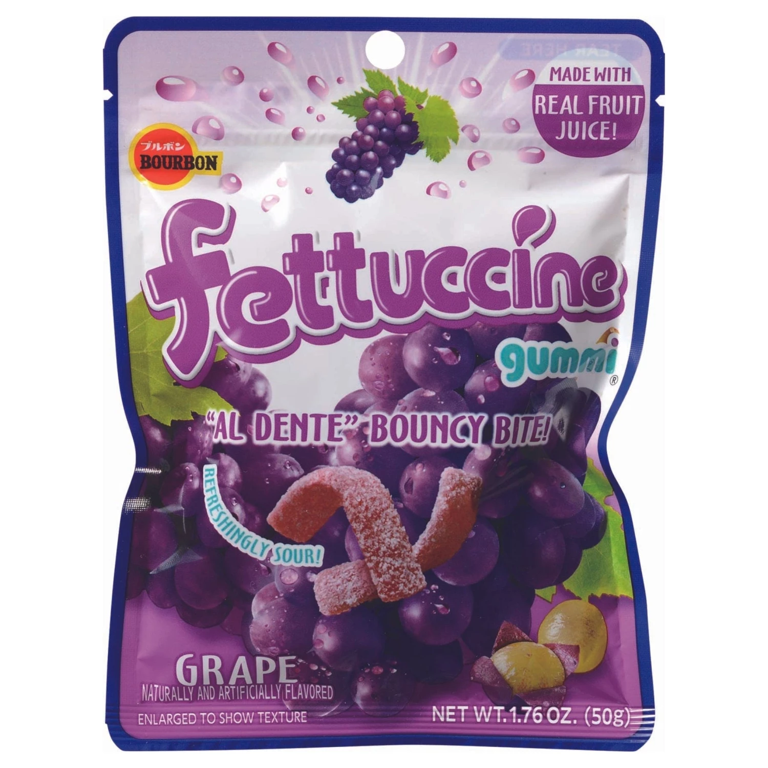 Japanese gummy strips with bursting grape flavor. These chewy candies are made with fruit juice from Italian grapes and coated with a puckery sour powder.