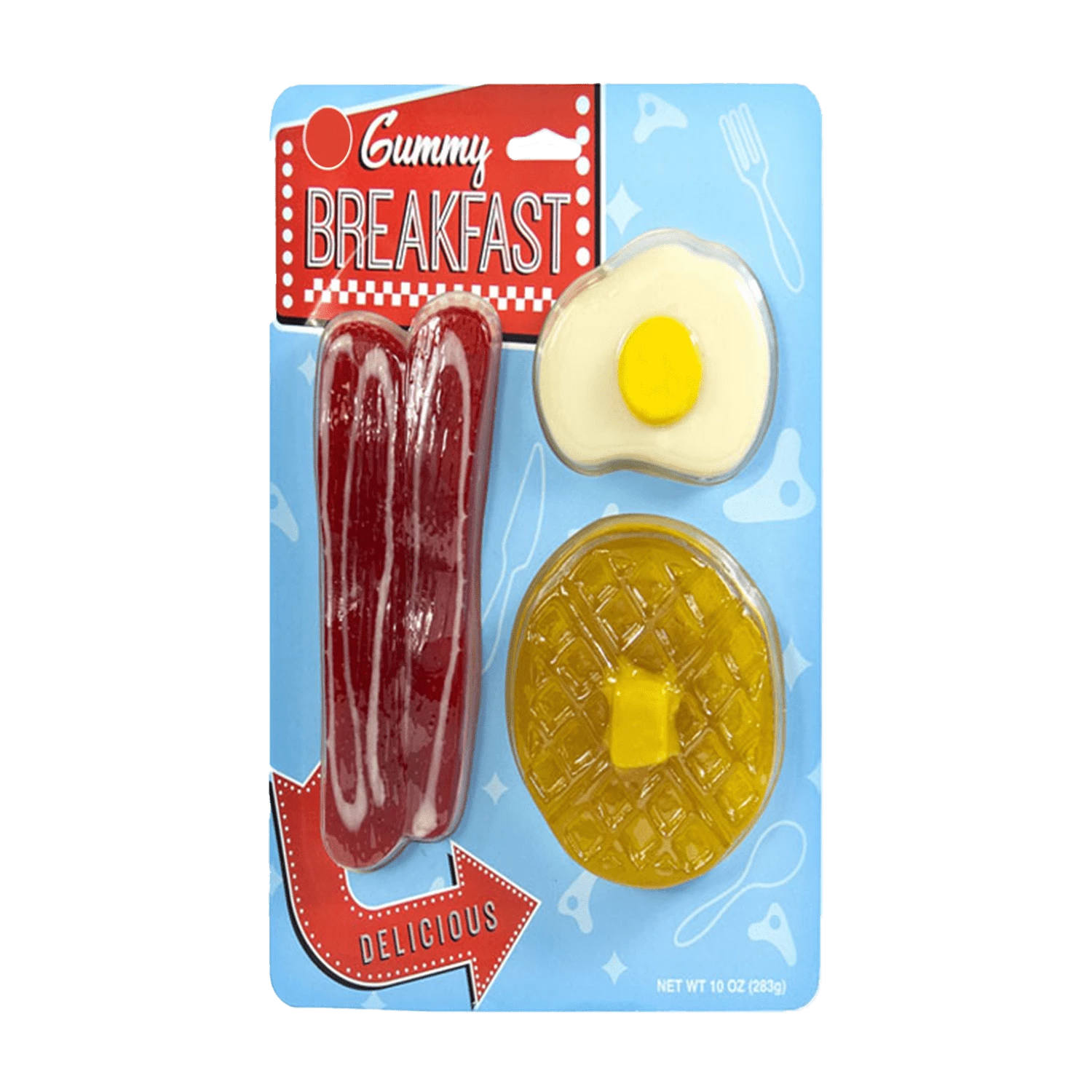 This Gummy breakfast set means that in fact can have candy for breakfast! With a whimsical combination of waffles, eggs, and bacon we are sure it’ll be a smile on your face. The waffle is maple flavors, gummy egg offers an unexpected berry blast flavor and the bacon of course is a sweet maple bacon flavoring.