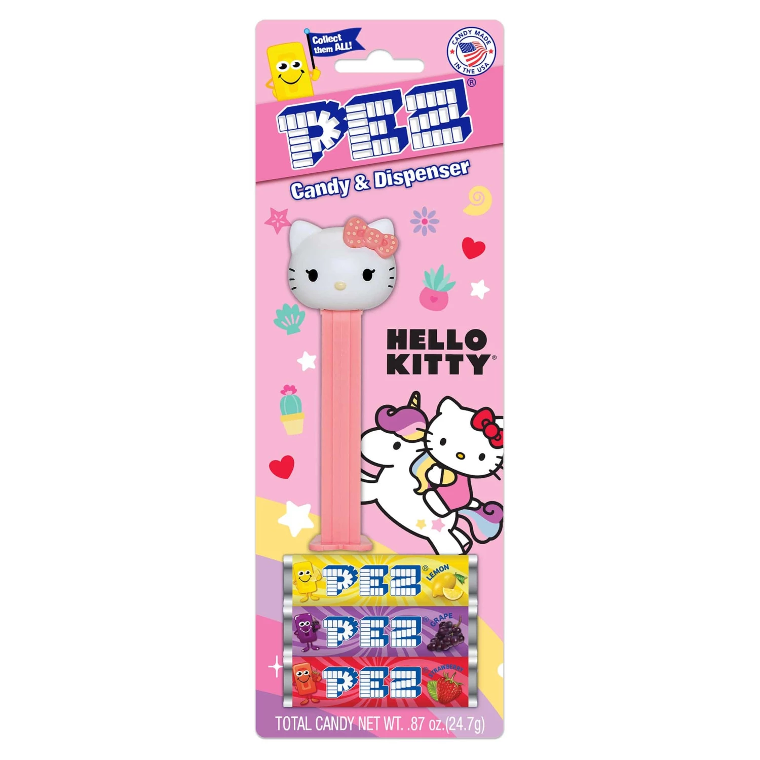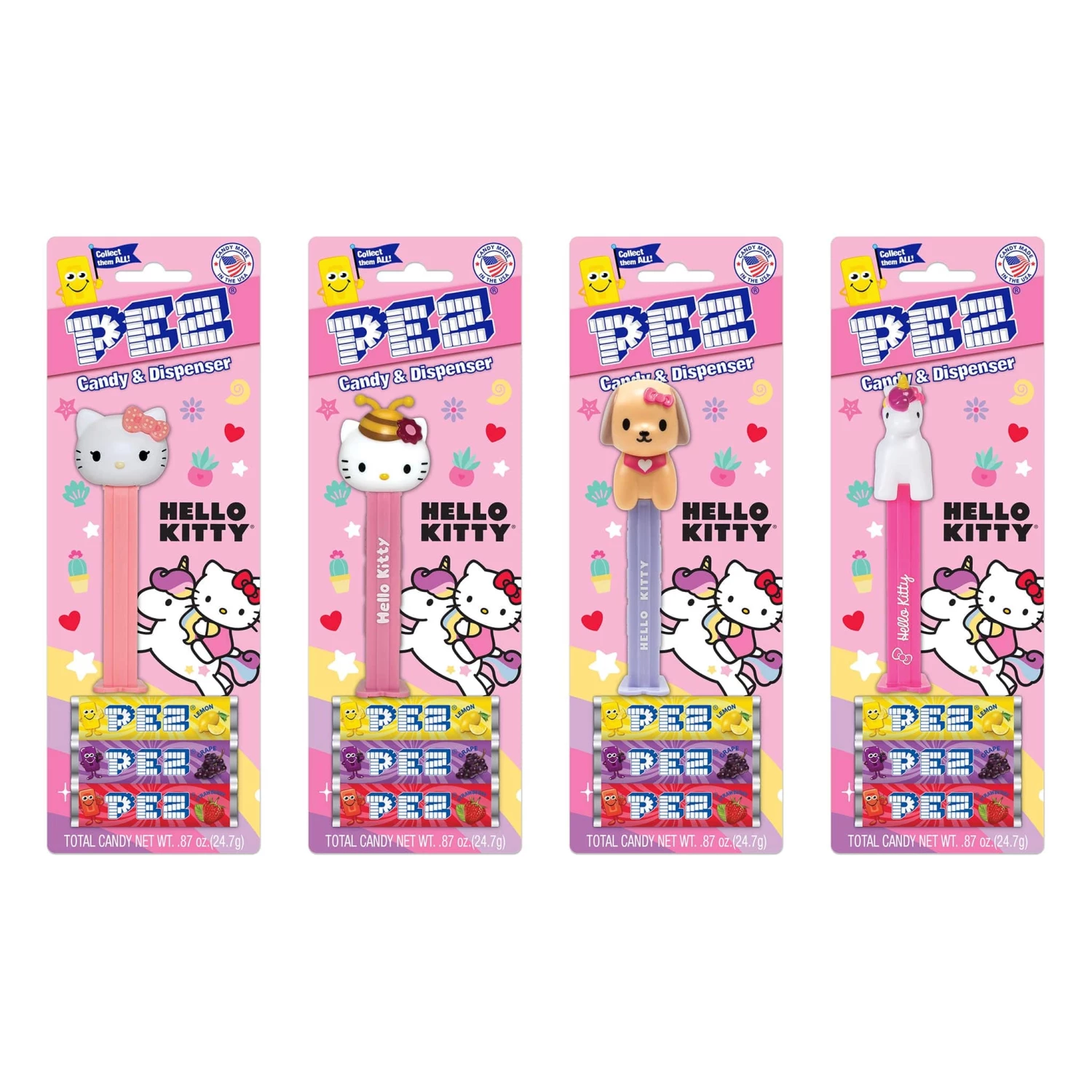 Hello Kitty is here, and she brought some friends! Collect four adorable members of the Sanrio family with these Hello Kitty-branded PEZ dispensers. Each one comes with three delicious flavors of PEZ candy.