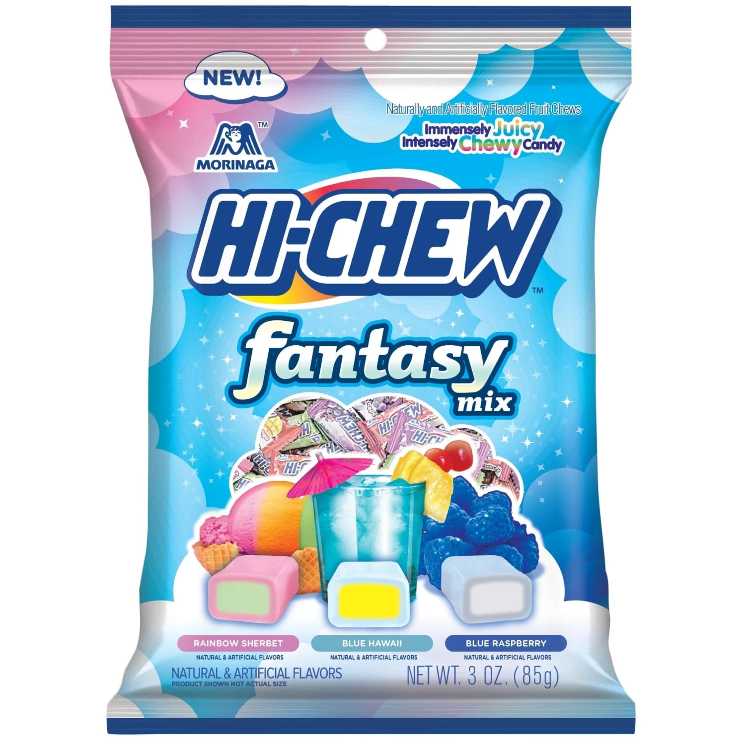 Soft, pillow-like taffy in three tropical fantasy flavors: Rainbow Sherbet, Blue Hawaii, and Blue Raspberry! Treat your tastebuds to a special fantasy oasis.