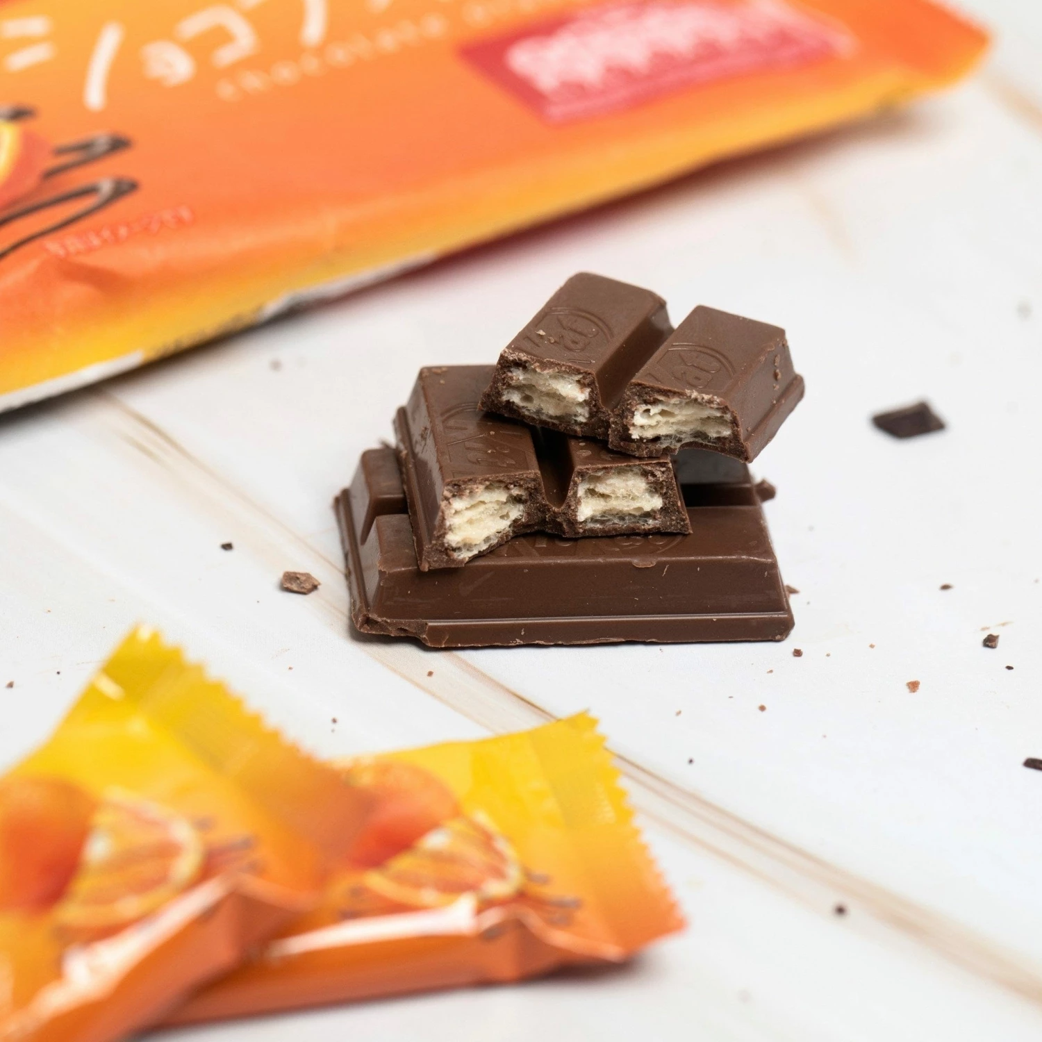 Delicious and classic Kit Kat sticks that are coated with smooth milk chocolate and fruity orange flavor.