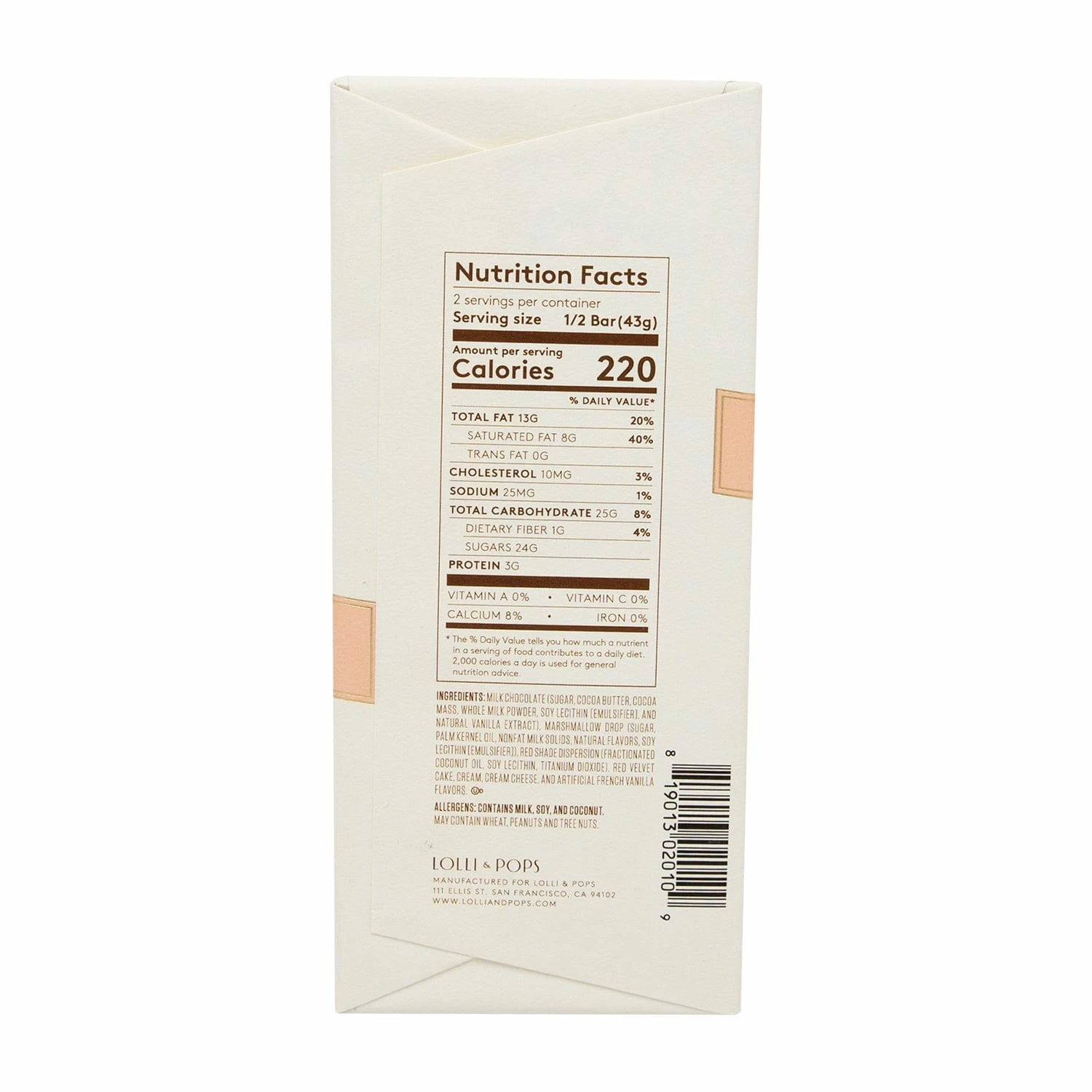 Smooth milk chocolate blended with drops of marshmallow and luscious red velvet. Every bite of this boutique chocolate bar combines rich cocoa with the decadence of fresh red velvet cake.