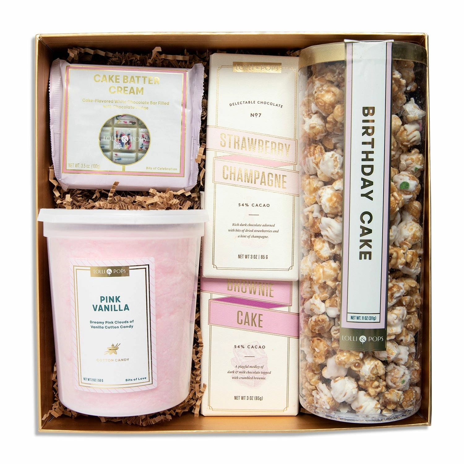 CONTAINS: 1 x Lolli & Pops Cake Batter Cream Bar (3.5 oz), 1 x Lolli & Pops Strawberry Champagne Signature Bar (3 oz), 1 x Lolli & Pops Brownie Cake Signature Bar (3 oz), 1 x Lolli & Pops Birthday Cake Popcorn Tube (11 oz), 1 x Lolli & Pops Pink Vanilla Cotton Candy (2 oz)