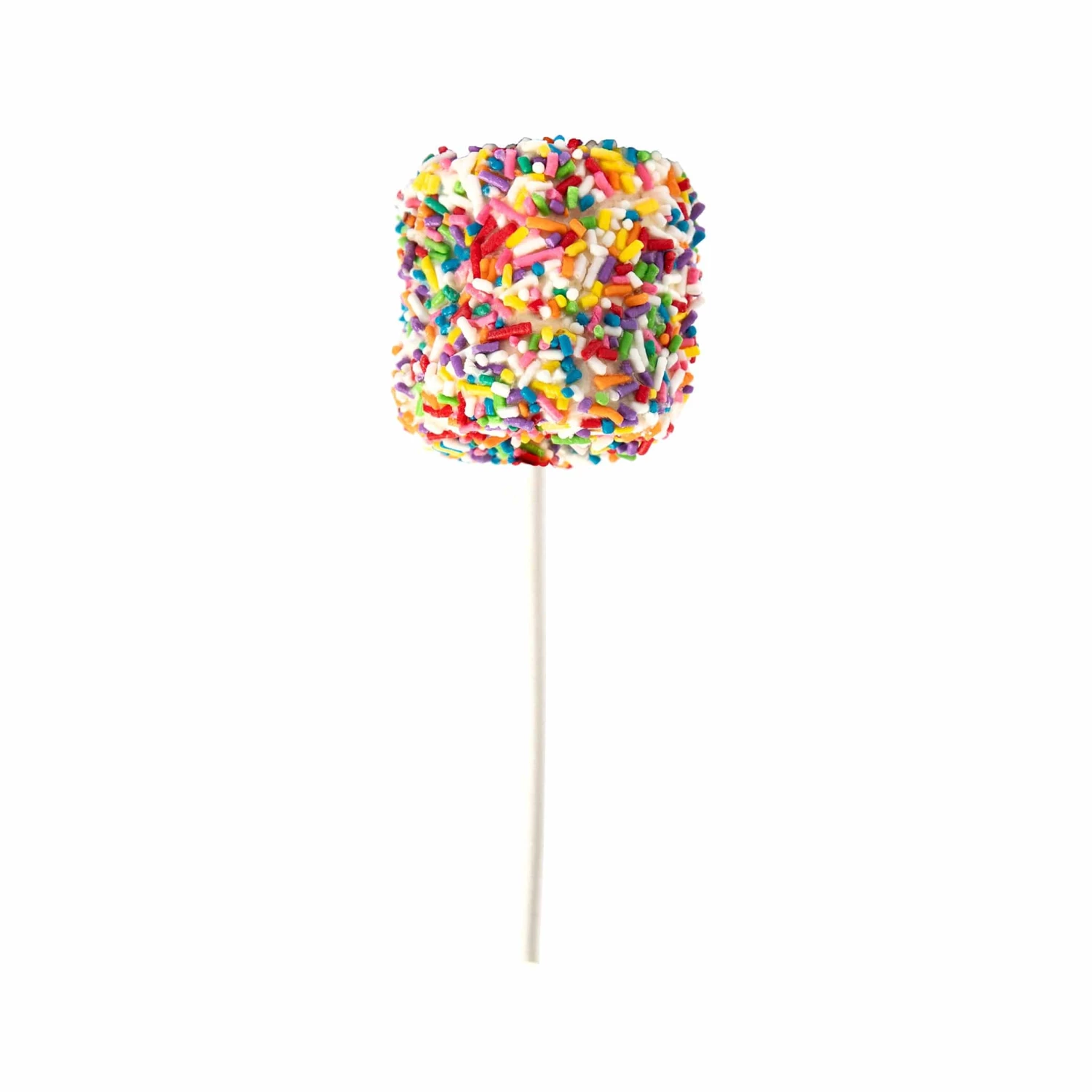 This marshmallow treat is chocolatey-dipped and coated in sprinkles. Enjoy a whole rainbow of delicious confetti candy! Comes with both chocolate and white chocolate coating options.*