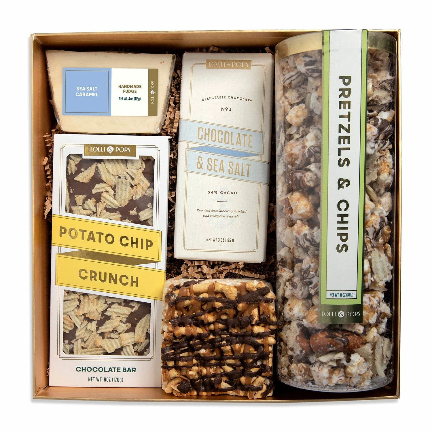 1 x Lolli & Pops Potato Chip Crunch Topp’d Bar (6 oz),1 x Lolli & Pops Sea Salt Caramel Fudge (4 oz),1 x Lolli & Pops Dark Chocolate & Sea Salt Signature Bar (3 oz),1 x Lolli & Pops Pretzels & Chips Popcorn Tube (11 oz),1 x Lolli & Pops Pretzel Surprise Crispy (6 oz)
