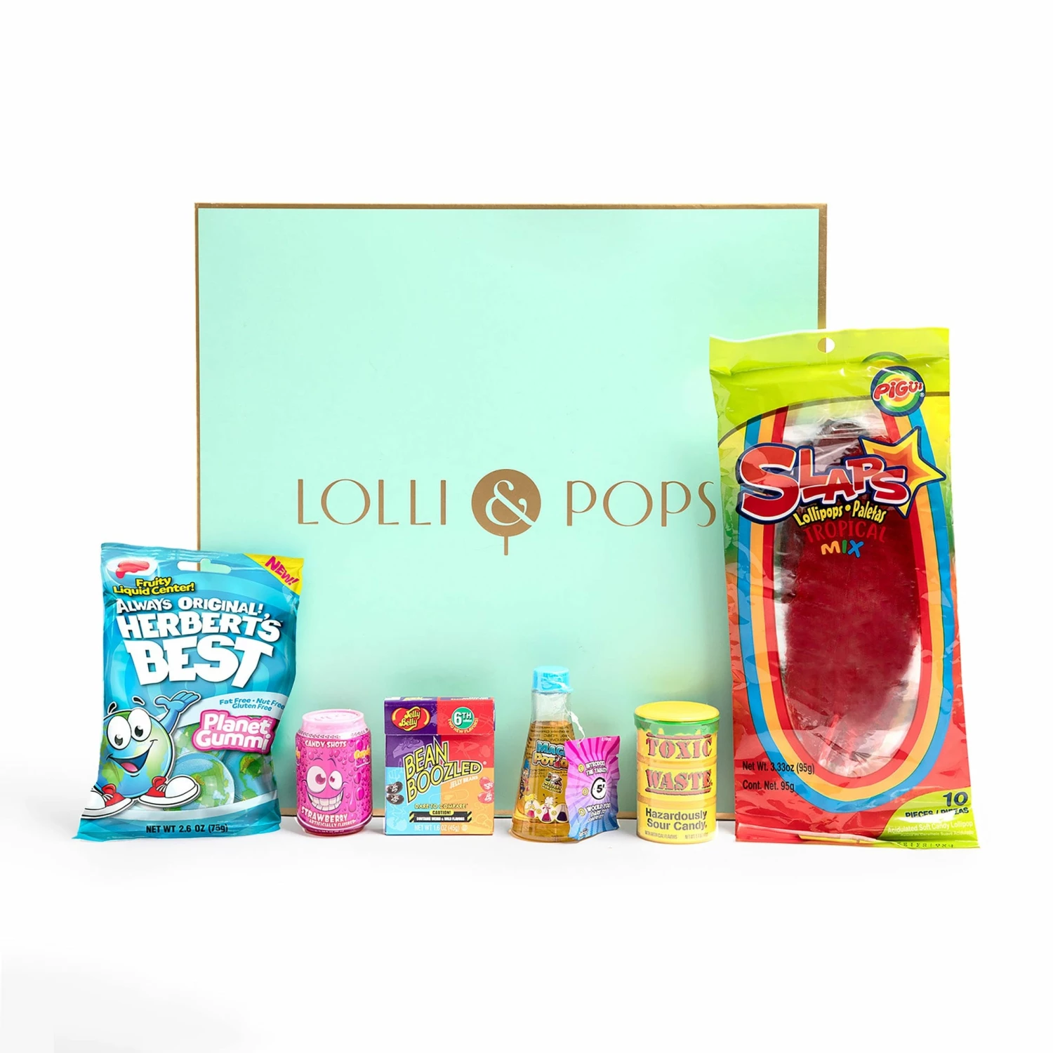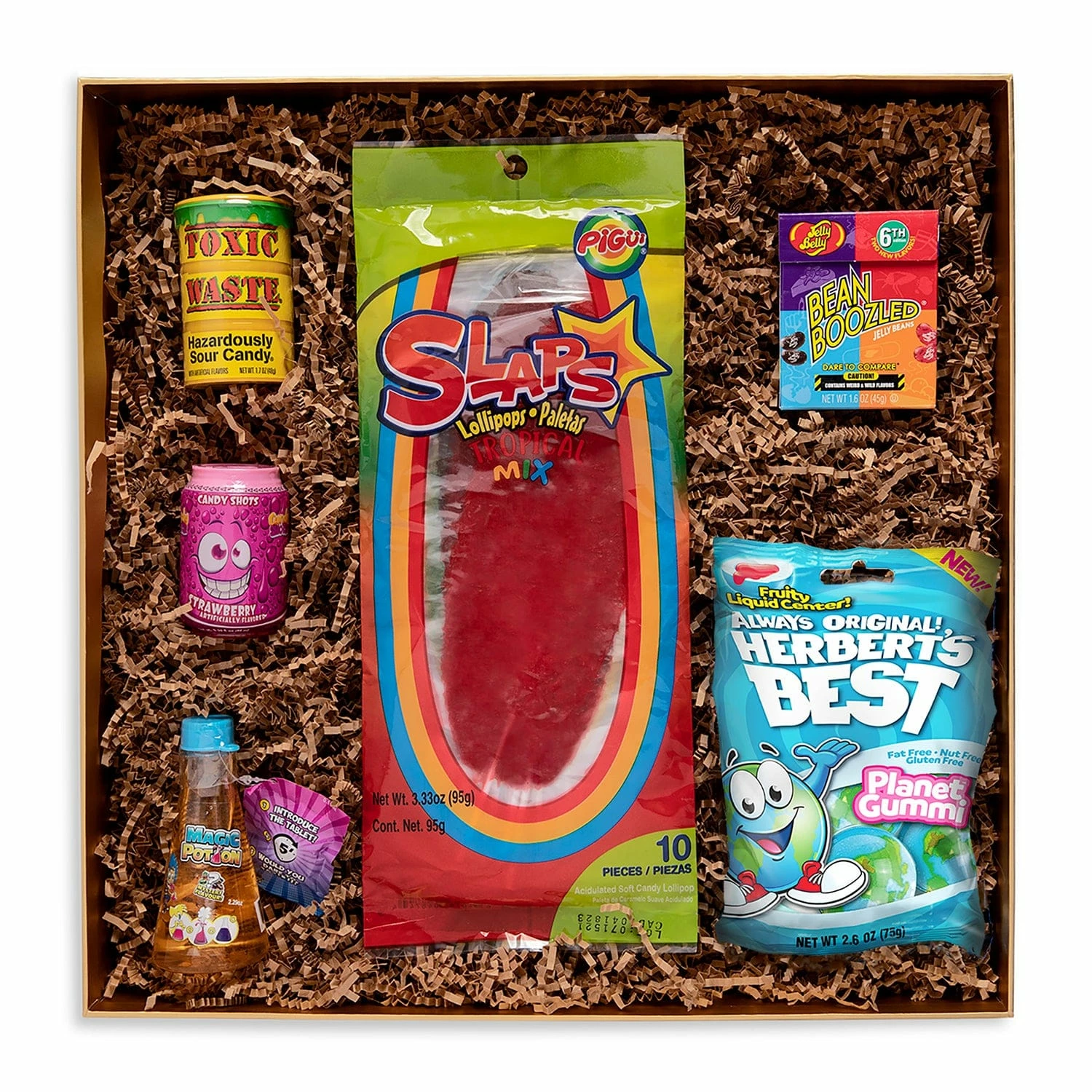 CONTAINS: 1 x Candy Shot (2.30 fl oz)* 1 x Slaps Tropical Lollipop (3.3 oz) 1 x Beanboozled Fliptop Box (1.6 oz) 1 x Magic Potion Bottle (2.29 fl oz) 1 x Toxic Waste Sour Candy Drum (1.7 oz)