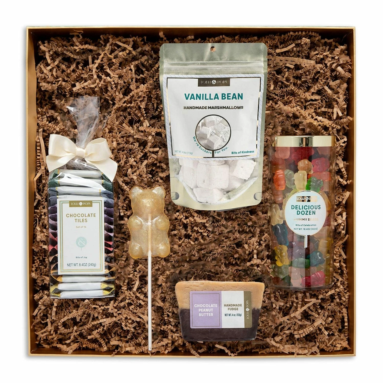 CONTAINS: 1 x Lolli & Pops Large Delicious Dozen Gummy Tube (18.4 oz) 1 x Lolli & Pops Shimmer Bear Lollipop (1.2 oz) 1 x Lolli & Pops 16-piece Chocolate Tile Bag (8.4 oz) 1 x Lolli & Pops Vanilla Bean Marshmallows (4 oz) 1 x Lolli & Pops Chocolate Peanut Butter Fudge (4 oz)
